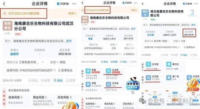 记者发现,2024年3月5日成立的湖北省康吉乐生物科技有限公司的法定代表人是汪文胜,巧合的是已经注销的海南康吉乐生物科技有限公司的股东及监事也是汪文胜。
