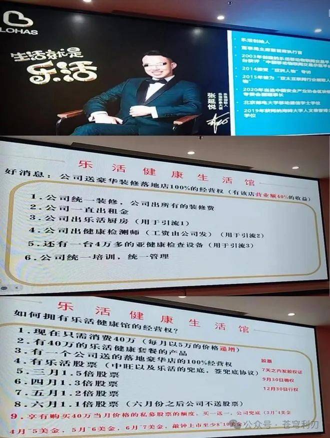 记者了解到,目前中旺控股与乐活共同开展乐活健康生活馆,乐活的创始人为张廷悦。中旺控股宣称,3月份只需消费40万(每月以5万元的价格递增)可以得到40万的乐活健康套餐的产品,有一个公司送的落地豪华店的100%经营权,有该店40%的收益。送乐活股票,中旺以及乐活兜底,签兜底协议;三月1.5倍股票、四月1.3倍股票、五月1.2倍股票、六月1.1倍股票(六月份之后公司不再送股票);享有购买40万当月价格的私募股票的额度,买一送一,公司兜底(3月4美金、4月5美金、5月6美金、6月7美金,敲钟上市至少8-10美金)。