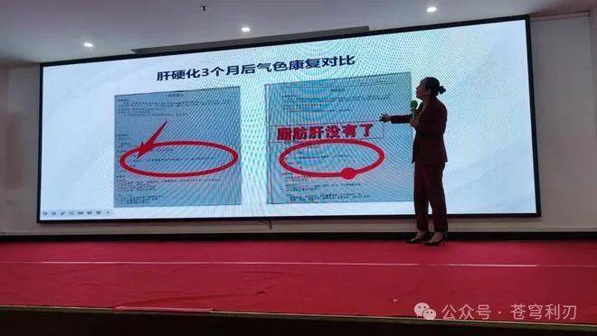中旺控股以大量案例,意图使人信服润生和养产品的效果,给大家呈现肝硬化3个月后气色康复对比图,称脂肪肝没有了。
