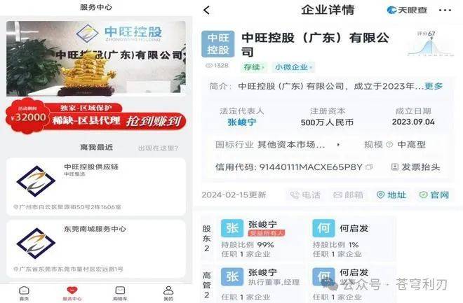 中旺甄选APP显示,中旺控股的主体公司为中旺控股(广东)有限公司,该公司成立于2023年9月4日,法定代表人张峻宁,注册资本500万人民币,股东张峻宁和何启发。