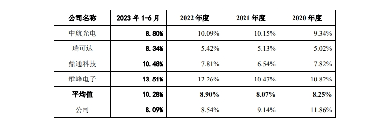 此外,盛凌电子的毛利率在2020年-2023年上半年(简称:报告期内)不断上涨,2023年上半年已经达到43.31%,而同行可比公司的均值却处于小幅下滑的状态,趋势相悖。同时,公司的核心竞争力也不强,发明专利少于可比公司,研发费用率也持续下滑。公司取得如此高的毛利率成绩,合理性存疑。
