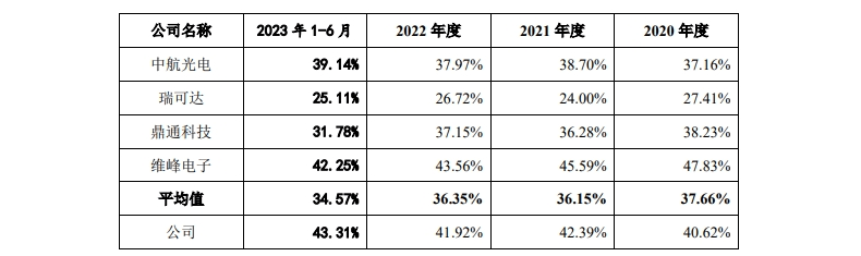 而以这些同行业可比公司的平均水平来看,报告期内毛利率分别达到37.66%、36.15%、36.35%、34.57%,不仅出现了与盛凌电子不相符的下滑趋势,而且还持续低于盛凌电子。