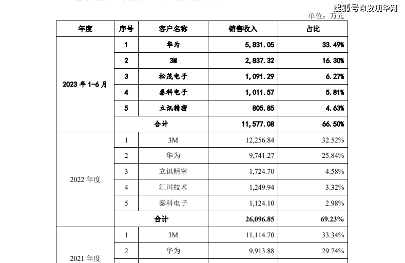 招股书显示,盛凌电子存在客户集中度高的风险。报告期内,盛凌电子对前五名客户销售额合计占当期营业收入的比例分别为74.77%、72.02%、69.23%、66.50%,持续高于60%。其中华为在2020年、2023年上半年是公司的第一大客户,而3M公司在2021年、2022年是公司的第一大客户,华为和3M与盛凌电子之间的交易情况值得关注。