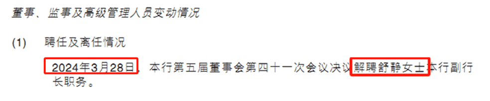 根据重庆农商行年报,2024年3月28日,该行第五届董事会第四十一次会议决议解聘舒静副行长职务。在年报中,该行并未提及解聘舒静副行长职务的具体原因。