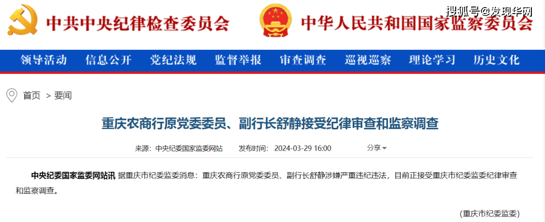 2024年3月29日,中央纪委国家监委网站发布公告,重庆农商行原党委委员、副行长舒静涉嫌严重违纪违法,目前正接受重庆市纪委监委纪律审查和监察调查。