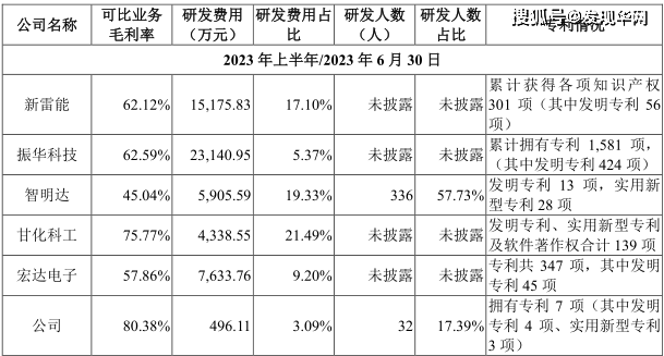 而在招股书中,和科凯电子用来对比的新雷能、振华科技、智明达、宏达电子、甘化科工5家公司研发费用率平均值分别为10.48%、11.36%、13.63%、14.5%,显著高于科凯电子,科凯电子的研发费用率在同行中处于垫底水平。