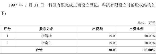 据了解,科凯电子的前身为科凯有限,成立于1997年7月31日,创始人为李清增、李南生,注册资本为30万元,但离奇的是,根据招股书披露,这两个创始人在公司设立后就转让全部股权,至2021年,公司实际控制人已变更为王建绘、王建纲兄弟以及他们的子女。而且奇怪的是,招股书并未介绍李清增、李南生退股原因及过程。