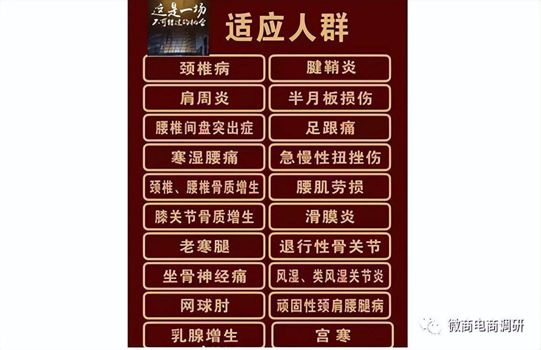 更令人称奇的是,这款产品的适用范围甚至还包括了多种疾病在内,如“颈椎病、肩周炎、腱鞘炎、乳腺增生、滑膜炎、坐骨神经痛”等。