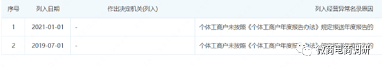 截至目前,该店铺还处在经营异常状态,原因是在2019年和2021年未按照《个体工商户年度报告办法》规定报送年度报告。