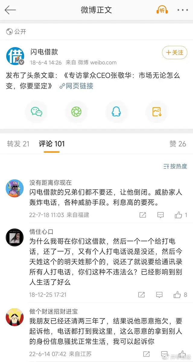 掌众金服为中新控股疯狂敛财的同时,其闪电借款的名声也逐渐成了“过街老鼠”。开甲财经注意到,2018年6月,闪电借款官方微博发布专访掌众CEO张敬华的文章,评论区却基本成了借款人的吐槽聚集地。