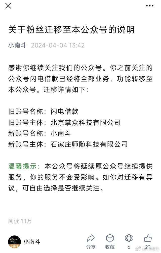4月4日,微信公众号小南斗发布《关于粉丝迁移至本公众号的说明》显示:你之前关注的公众号“闪电借款”已将全部业务、功能转移至本公众号,旧账号名称:闪电借款,旧账号主体:北京掌众科技有限公司;新账号名称:小南斗,新账号主体:石家庄师随科技有限公司。