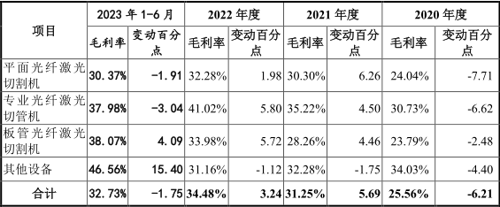 此外,另一项产品专业光纤激光切管机2023年上半年毛利率较2022年下降3.04个百分点,公司称,主要系境内市场竞争激烈,为扩大品牌影响力及提升市场份额,公司加大专业光纤激光切管机优惠力度,专业光纤激光切管机境内平均销售单价较2022年度下降25.44%,境内毛利率由2022年的 36.15%下降至30.41%。