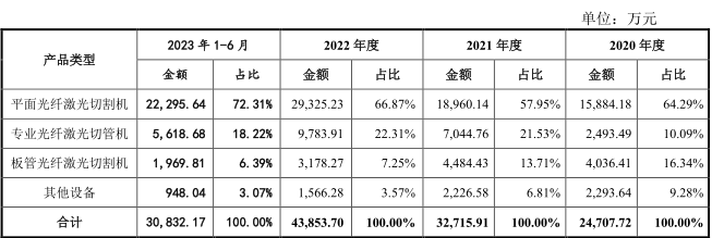 招股书显示,宏石激光的主要产品包括平面光纤激光切割机、专业光纤激光切管机、板管光纤激光切割机等。其中,平面光纤激光切割机报告期内收入分别为10.94亿元、14.05亿元、11.88亿元和7.80亿元,占主营业务收入的比例分别为64.16%、61.38%、64.69%和72.02%。是其绝对的主力产品,