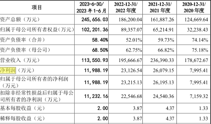 业绩方面,报告期内(2020年-2023年上半年),宏石激光的营收分别为17.87亿元、23.64亿元和19.57亿元、11.35亿元,净利润分别为7995.41万元、2.61亿元、2.31亿元和1.20亿元,扣非后净利润分别为7159.32万元、2.45亿元、2.25亿元和1.12亿元。