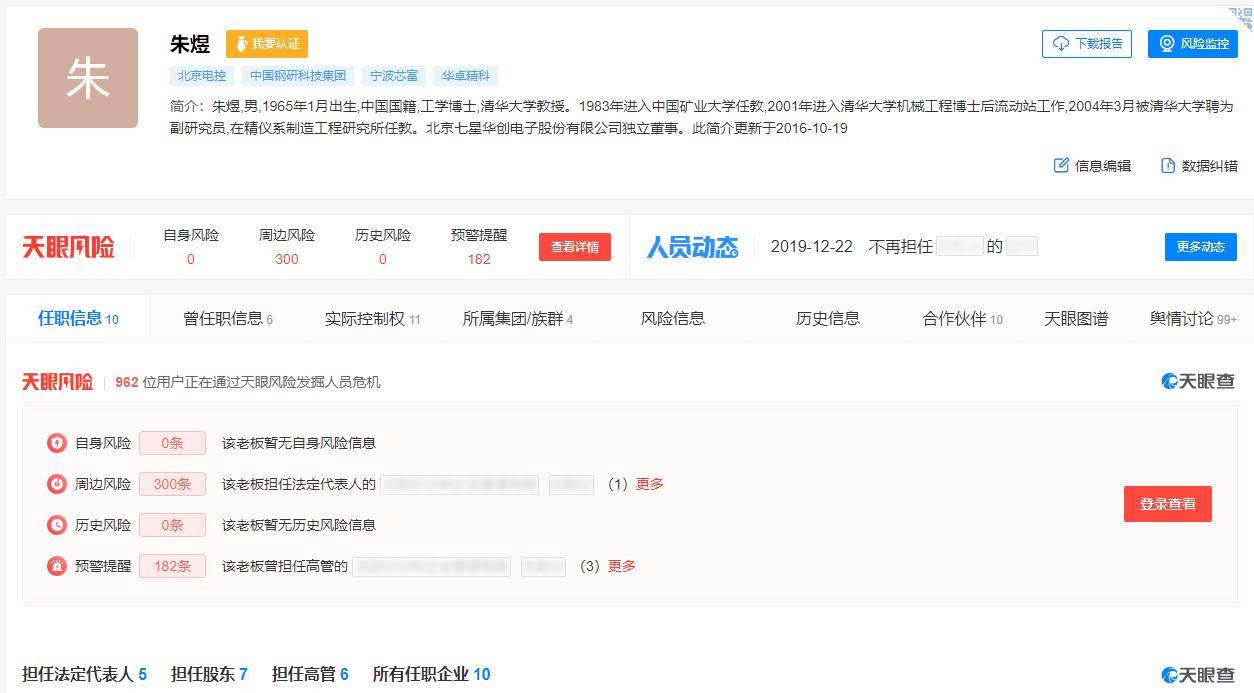 天眼查数据显示,朱煜有10条任职信息,其中担任法定代表人5家公司,担任高管6家,担任股东7家,取得实际控制权的公司有11家。尤为注意的是,朱煜周边风险有300条,另有预警提醒达182条。