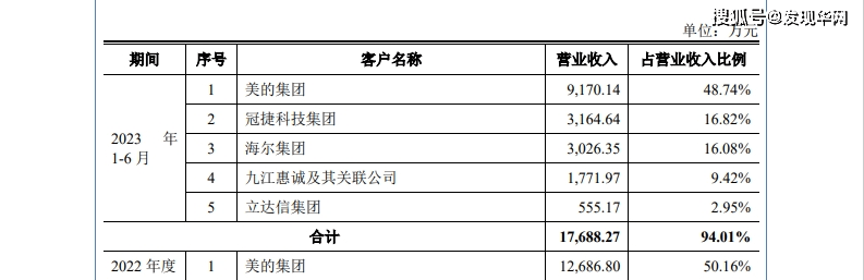 报告期内,宏海科技主要向美的集团销售的产品为空调结构件、热交换器,公司来源于美的集团的营业收入分别为5506.44万元、7877.66万元、1.269亿元、9170.14万元,占当期营业收入的比例分别为39.67%、41.81%、50.16%、48.74%,报告期内一直在增长,直到2022年超出了50%。