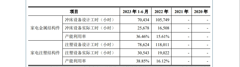 如下图所示,泰国冠鸿的家电金属结构件的产能利用率在2022年-2023年上半年分别为15.61%、36.46%;家电注塑结构件的产能利用率分别为16.12%、38.85%,非常低。