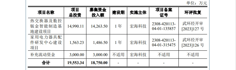 招股书显示,本次IPO宏海科技计划募集资金1.875亿元,其中1.426亿元用于热交换器及数控钣金智能制造基地建设项目,1486.5万元用于家用电力器具配件研发中心建设项目。如果成功上市发行,未来宏海科技的生产能力将进一步加强,产能也将扩大。