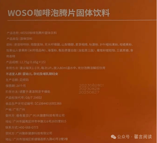 经查,该产品生产许可证编号为SC10644018301366,产品名称:WOSO咖啡泡腾片固体饮料,很显然这只是一个普通食品,并不具备任何功效。