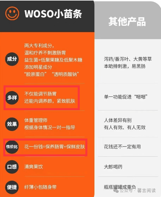 然而WOSO小苗条这款产品的宣传更是神乎其神,宣称不仅能调节肠胃,还能内调养颜,紧致肌肤,花一分钱=保养肠胃+保鲜皮肤......