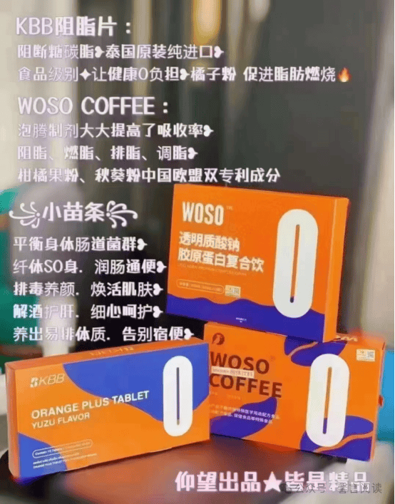 然而通过该平台代理商提供的推广资料显示,该平台并非WOSO减脂咖啡一种产品,其余搭配的还有KBB阻脂片、WOSO小苗条,共三种产品搭配使用。