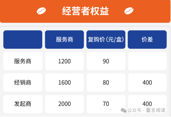 代理的话购买4800元一箱的货,一箱就是40盒,拿货价相当于120元一盒,拿完以后就有了公司的授权成为服务商,有授权后招募新的代理商自己可以提成1200元,找上级补货只需要给上级3600元,也就是说成为服务商每盒的拿货价是90元,当直推3个服务商(直推3个4800元),升级为经销商,经销商补货3200元一箱,一盒80元。不仅如此,经销商下面的服务商每招一个4800元的服务商进来,你就可以挣他们400块钱的拿货差价,当自己下面的三个服务商都升级为经销商后,这时候就可以升级为发起商,发起商拿货直接对接公司,这时候拿一箱货只需要花费2800元,每箱的利润就是2000元。