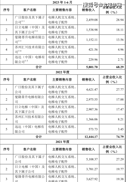 除了上述问题,目前,伟邦科技还存在大客户依赖较为严重的问题。招股书显示,报告期内,伟邦科技对前五名客户销售额占同期营业收入的比例分别为75.42%、78.98%、74.79%和68.29%,其中,对日立电梯(中国)及其下属子公司和广日股份及其下属子公司的合计销售额占比49.88%、47.06%、45.25%和47.06%。