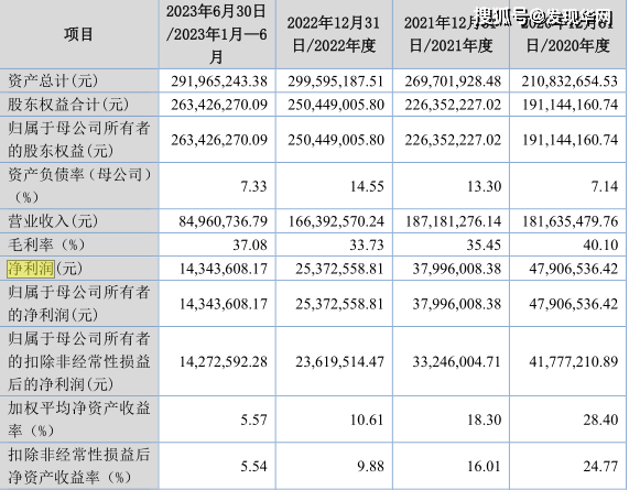 根据招股书数据,2020年-2023年上半年(下称“报告期内”),伟邦科技实现的营业收入分别为1.82亿元、1.87亿元、1.66亿元和8496.07万元,归属于母公司所有者的净利润分别为4790.65万元、3799.60万元、2537.26万元和1434.36万元。
