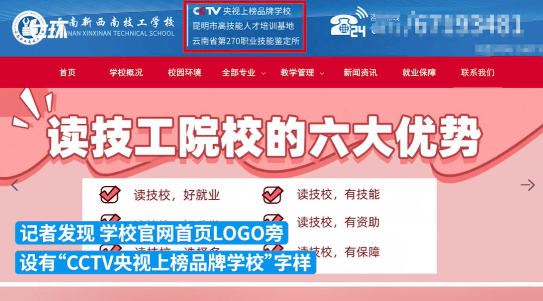 记者发现,该学校官网首页LOGO旁设有“CCTV央视上榜品牌学校”字样。