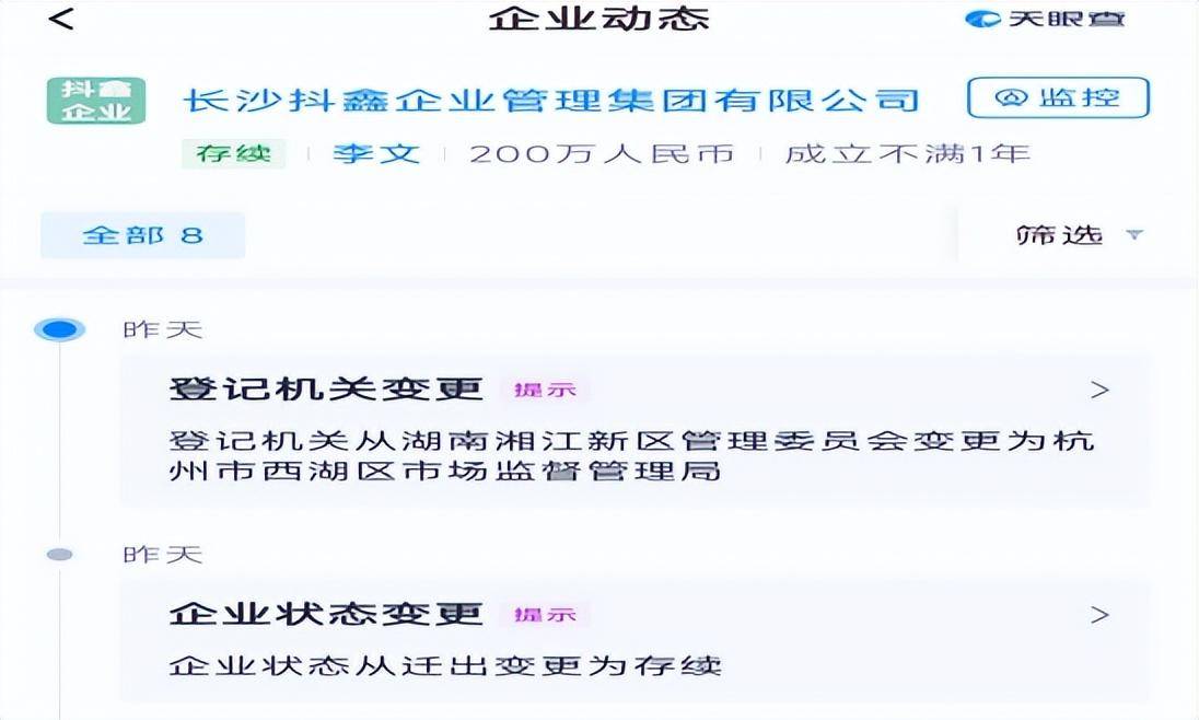 天眼查显示:近日,长沙抖鑫企业管理集团有限公司登记机关从湖南湘江新区管理委员会变更为杭州市西湖区市场监督管理局,企业状态从迁出变更为存续。
