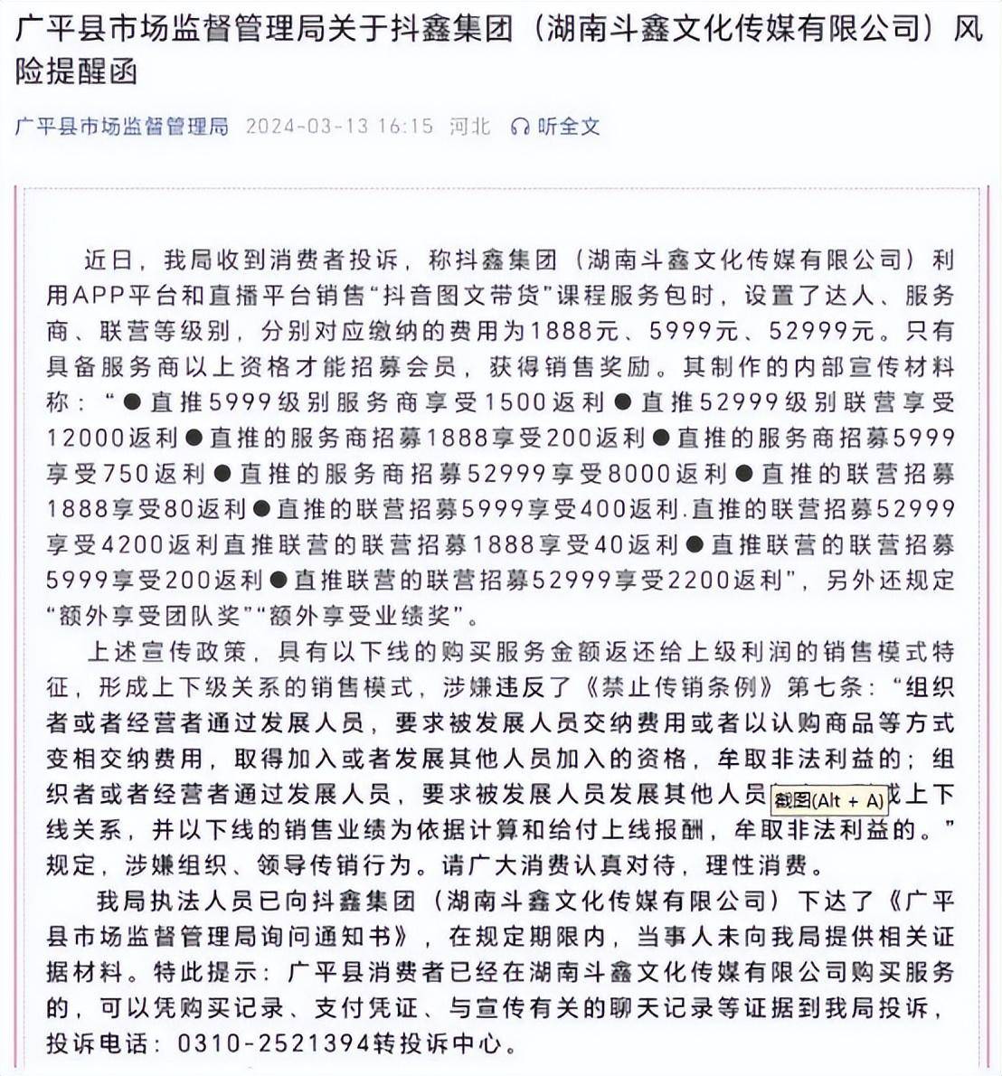 该风险提醒函称:“我局收到消费者投诉,称抖鑫集团(湖南斗鑫文化传媒有限公司)利用APP平台和直播平台销售“抖音图文带货”课程服务包时,设置了达人、服务商、联营等级别,分别对应缴纳的费用为1888元、5999元、52999元。只有具备服务商以上资格才能招募会员,获得销售奖励。其制作的内部宣传材料称:“●直推5999级别服务商享受1500返利●直推52999级别联营享受12000返利●直推的服务商招募1888享受200返利●直推的服务商招募5999享受750返利●直推的服务商招募52999享受8000返利●直推的联营招募1888享受80返利●直推的联营招募5999享受400返利.直推的联营招募52999享受4200返利直推联营的联营招募1888享受40返利●直推联营的联营招募5999享受200返利●直推联营的联营招募52999享受2200返利”,另外还规定“额外享受团队奖”“额外享受业绩奖”。