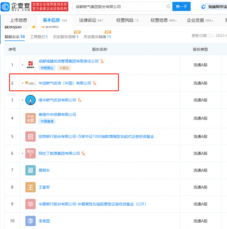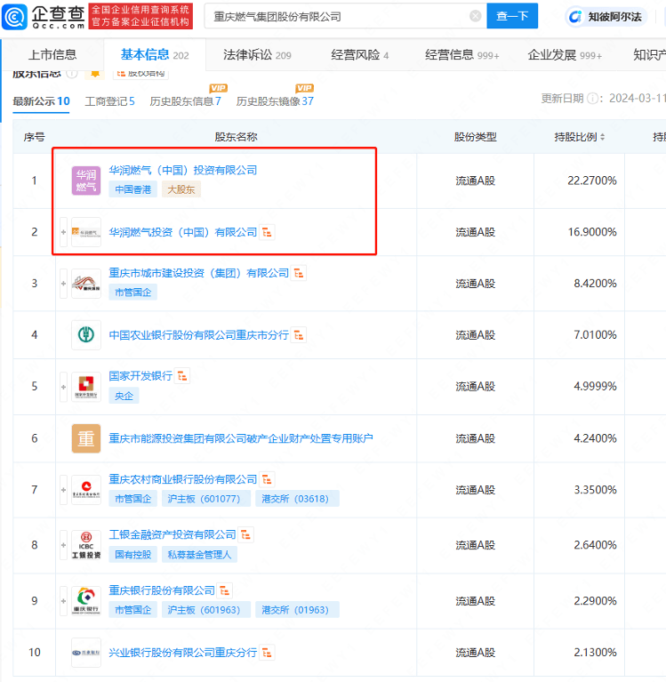 企查查公开数据显示,重庆燃气集团股份有限公司和成都燃气集团股份有限公司背后的股东,均有华润燃气投资(中国)有限公司。查阅2023年三季报发现,华润公司旗下的两家公司——华润燃气(中国)投资有限公司和华润燃气投资(中国)有限公司,占据重庆燃气集团股份有限公司股东的前两名,持股比为39.17%,已成为重庆燃气公司的绝对大股东。