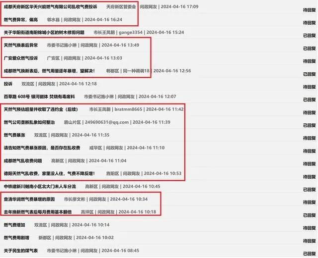 在四川问政平台上,从4月14日开始,成都多个区的网友关于燃气计费异常的投诉超过二十条,多反映更换新燃气表后,在使用习惯未有较大变化的情况下,燃气表显示的用气量大增。比如4月14日,成都郫都区一名业主称,从2023年开始成都燃气换了新的燃气表后,燃气使用量暴增,其通过成都燃气微网厅查询到家里2022全年燃气使用量为287立方米,2023年换新表后,全年用气量为445立方米,到了2024年,仅仅1至4月的用气量就高达595立方米。对此,郫都区网络理政办回应称,已责令责任单位开展调查和处理。