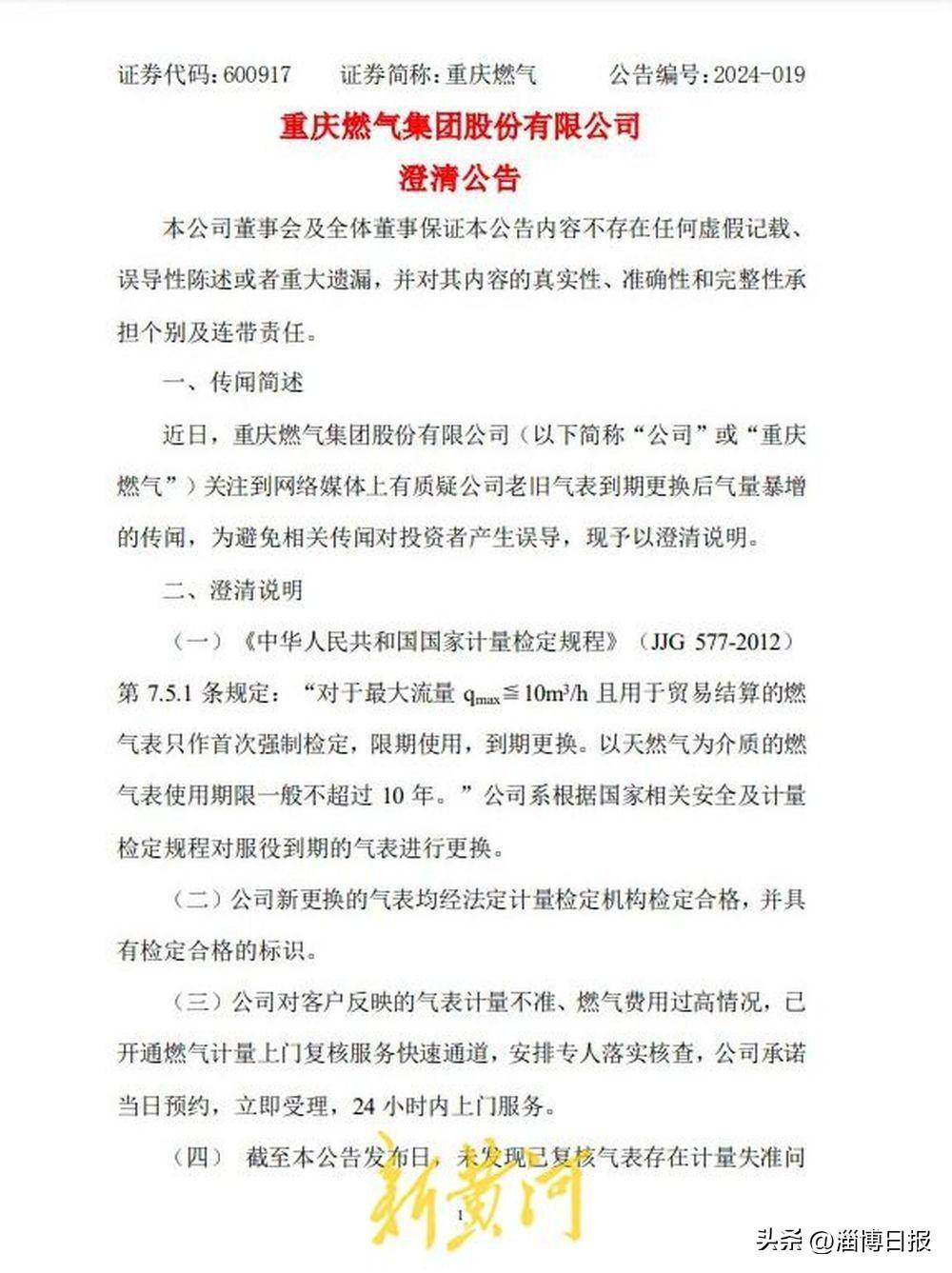 重压之下,重庆燃气集团作出公开回应,称已开通燃气计量上门复核服务快速通道,并自觉接受社会监督。4月12日,重庆燃气集团又发布《澄清公告》,称该公司“新更换的气表均经法定计量检定机构检定合格,并具有检定合格的标识”,且“截至本公告发布日,未发现已复核气表存在计量失准问题”。