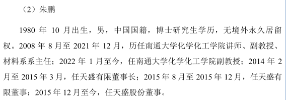 公开资料显示,朱鹏出生于1980年,为博士研究生学历,在2014年2月担任天盛股份董事长之前,就已是南通大学化学化工学院讲师,目前,其担任公司董事的同时,仍然在南通大学任化学化工学院副教授。或许天盛股份正是为了借助朱鹏这种专业形象来提升公司在投资者和客户中的形象。