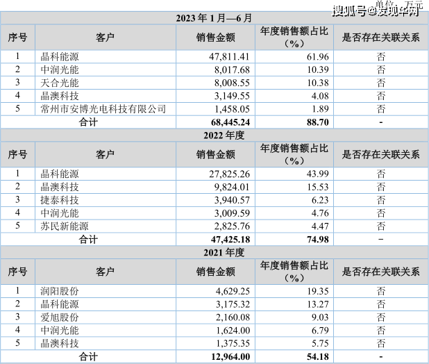 报告期内,天盛股份对前五名客户的销售收入分别为1.83亿元、1.3亿元、4.74亿元及6.84亿元,占当期营业收入的比例分别为61.18%、54.18%、74.98%和88.7%,占比较高。其中,2022年-2023年上半年,公司来自第一大客户晶科能源的销售收入占当期营业收入比例为43.99%、61.96%,超过50%,公司对晶科能源存在重大依赖。