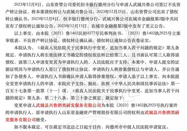 今年3月裁判文书网披露的《借款合同纠纷案件执行异议裁定书》显示了更详细的信息:2023年12月8日,山东省资管公司委托恒丰银行德州分行与武城县兴鲁酒类研发服务公司(下称“武城兴鲁公司”)签订不良资产转让协议,将本案债权转让给了武城兴鲁公司。