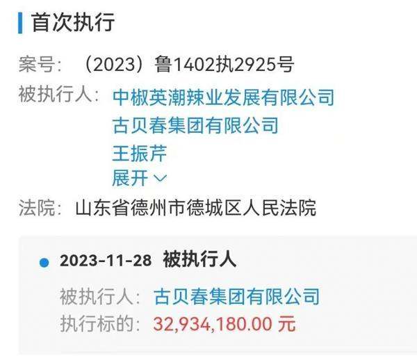 因中椒英潮无力偿还,古贝春集团承担担保责任被追偿。公开案件信息显示,2023年11月28日,古贝春集团被德州市德城区法院强制执行,涉案标的金额3293.42万元,申请执行人为山东省资管公司。