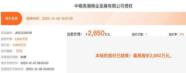 变化出现在几天后的2023年12月1日。当天,中椒英潮相关债权在山东产权交易信息中心挂牌,转让底价为2650万元。