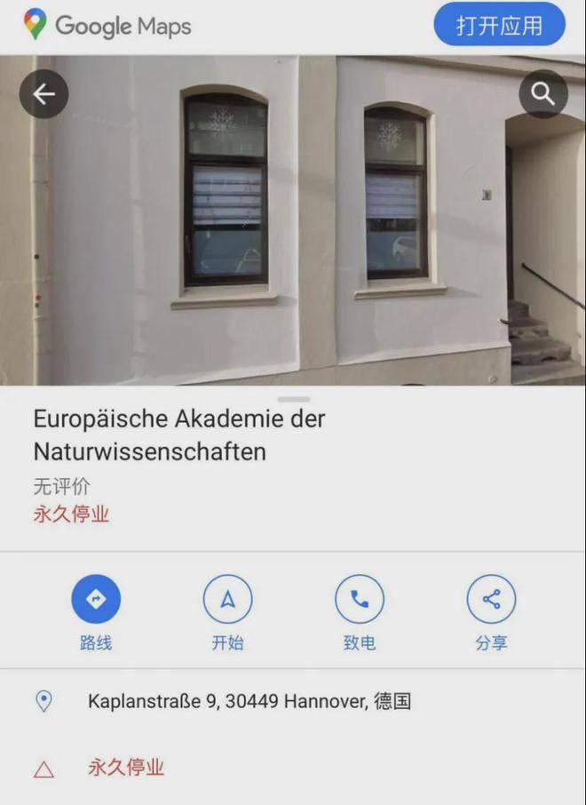更有些蹊跷的是,在Google地图搜索Europasche Akademie der Naturwissenschaften可以发现,其官方地址完全不是想象中的气派辉煌,也毫无其描述的那样具有学术氛围,更像是一个街边楼房,甚至连组织名字都没有。更关键的是,在地图下方还写着四个字:“永久停业”。细细一想,在国内宣传获得该院士荣誉的新闻报道中,很多都晒了收到的证书,但没有一个人晒过所谓欧洲科学院的照片,以及何时现场接受证书。