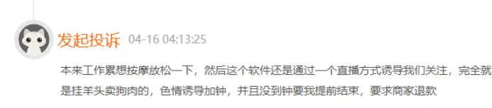 一位消费者在4月16日投诉称,“本来工作累想按摩放松一下,然后这个软件还是通过一个直播方式诱导关注,完全就是挂羊头卖狗肉的,色情诱导加钟,并且没到钟要我提前结束,要求商家退款。”