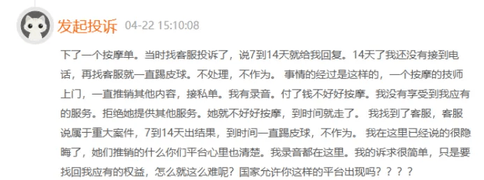 还有一位消费者4月22日投诉称,“我没有享受到我应有的服务。拒绝她提供其他服务。她就不好好按摩,到时间就走了。我找到了客服,客服说属于重大案件,7到14天出结果,到时间一直踢皮球,不作为。我在这里已经说的很隐晦了,她们推销的什么你们平台心里也清楚。我录音都在这里。”