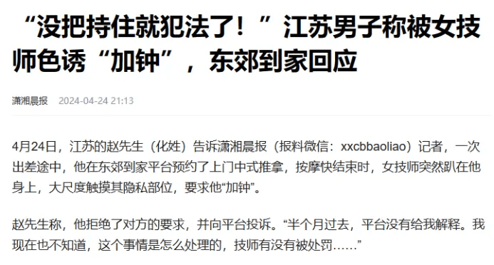 据潇湘晨报4月24日文章称,一位赵先生出差途中,在东郊到家平台预约了上门中式推拿,按摩快结束时,女技师突然趴在他身上,大尺度触摸其隐私部位,要求他“加钟”。