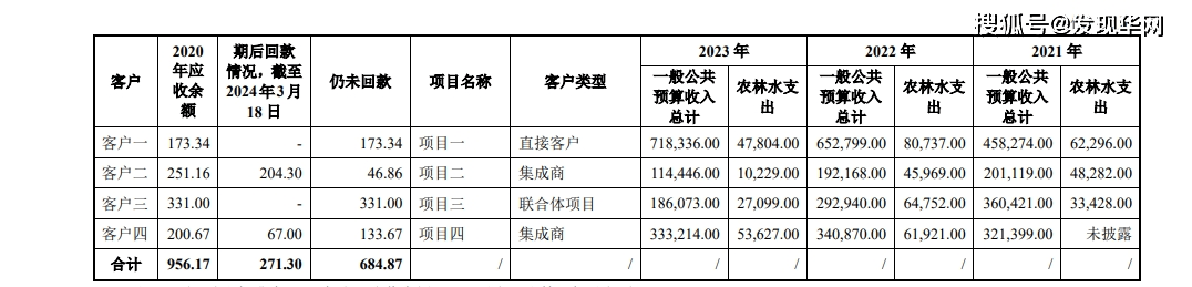 而且天演维真仍存在较大金额的应收账款未收回,截至2023年9月30日期后回款率分别为54.92%、38.99%、33.66%、16.22%,其中,有几笔2020年的应收账款截至招股书披露时间,仍未收回,如下图所示,应收余额总计956.17万元,包括直接客户、集成商、联合体项目等客户。