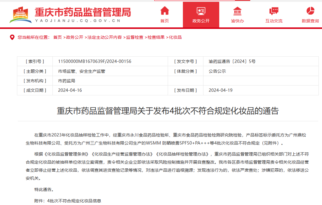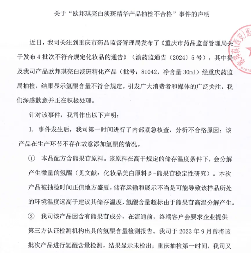近期,重庆市药品监督管理局发布了一则抽检通告,其中一款名为“欧邦琪亮白淡斑精华”的产品被检出禁用成分氢醌,含量131μg/g,此事在行业内引发广泛关注和讨论。