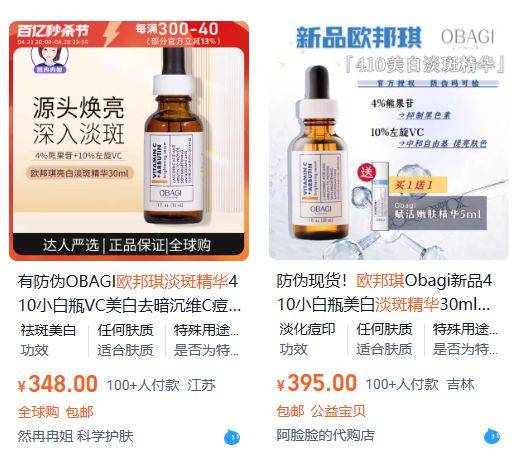 欧邦琪亮白淡斑精华(410小白瓶)于2022年在中国发布,对外宣称“双美白成分黄金配比,专攻美白淡斑”。根据备案信息,“欧邦琪亮白淡斑精华”配方中的主要功效成分,除了抗坏血酸(维生素C),还有熊果苷。