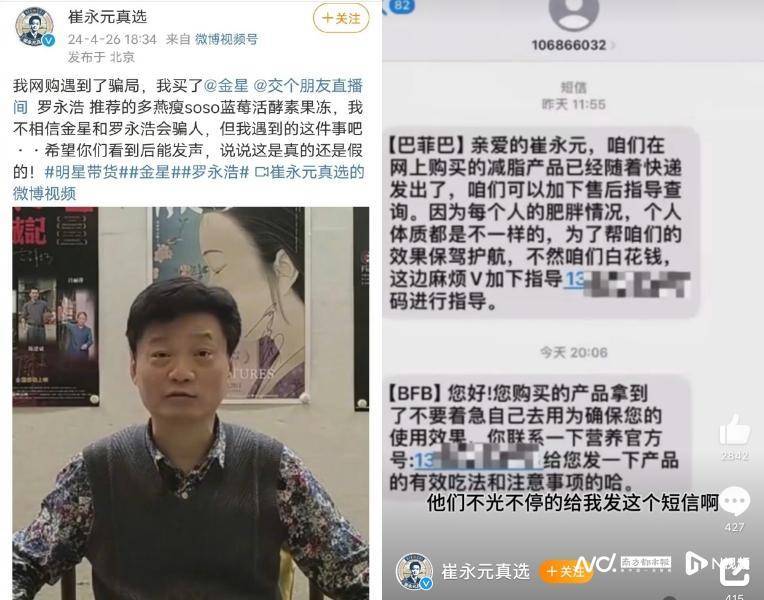 近日,崔永元在社交平台上发布视频,称购买了金星、罗永浩在直播间推荐的多燕瘦soso蓝莓活酵素果冻,并表示这是“骗子产品”,因为他在购买后被品牌方发送大量短信、打电话骚扰,称要在指导下食用。崔永元表示,这明明就是保健品或者食品,但在广告中没有披露禁忌。