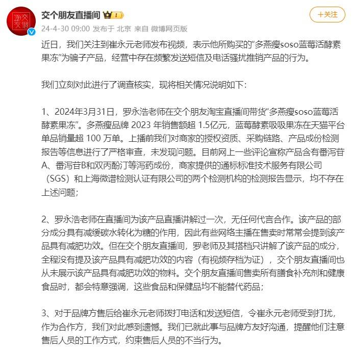 交个朋友直播间表示,2024年3月31日,罗永浩在交个朋友淘宝直播间带货“多燕瘦soso蓝莓活酵素果冻”。上播前交个朋友直播间对商家的授权资质、采购链路、产品成份检测报告等信息进行了严格审查,未发现问题。目前网上一些评论宣称产品含有番泻苷A、番泻苷B和双丙酚汀等泻药成份,商家提供的通标标准技术服务有限公司(SGS)和上海微谱检测认证有限公司的两个检测机构的检测报告显示,均不存在上述问题。