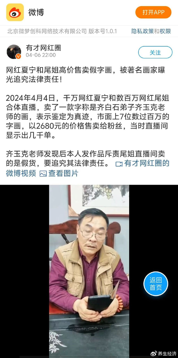 2024年4月4日,千万粉丝网红夏宁和数百万粉丝网红尾姐合体直播,卖了一款声称是齐白石弟子齐玉克老师的墨宝真迹,连麦还找“专业人士”鉴定为真品。市面上7位数过百万的字画以2680元的价格售卖给粉丝,当时直播间显示出售出几千单,今日“齐派”亲传弟子齐玉克老师发作品,怒斥尾姐直播间售卖假货,将会追究其法律责任。
