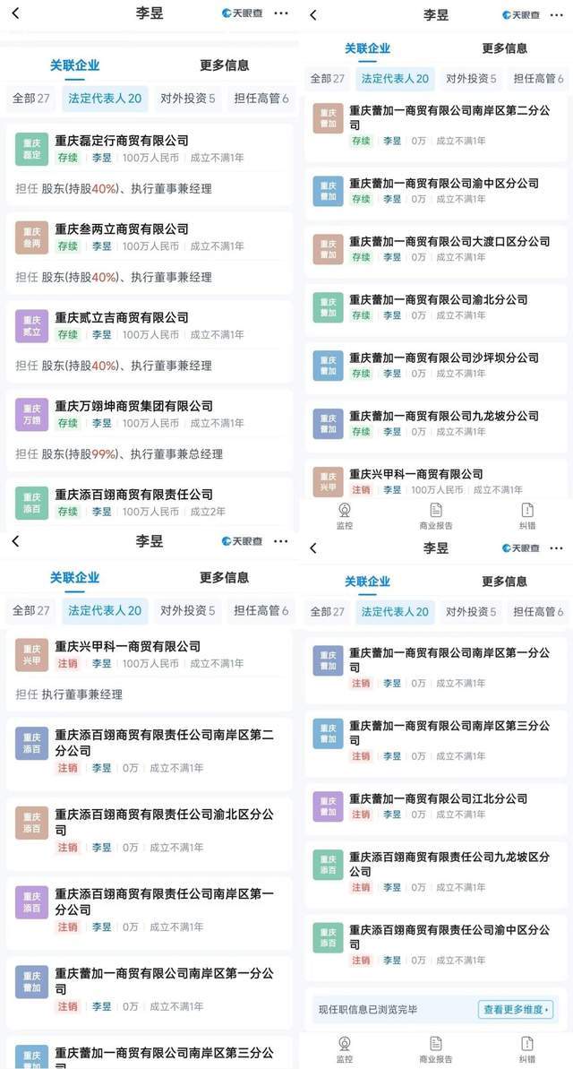 天眼查显示重庆万翊坤商贸集团有限公司的法人李昱,与之关联的公司由27家,作为法人代表的公司由20家,其中存续的有11家,分别是重庆磊定行商贸有限公司、重庆叁两立商贸有限公司、重庆贰立吉商贸有限公司、重庆万翊坤商贸集团有限公司、重庆添百翊商贸有限责任公司、重庆蕾加一商贸有限公司南岸区第二分公司、重庆蕾加一商贸有限公司渝中区分公司、重庆蕾加一商贸有限公司大渡口区分公司、重庆蕾加一商贸有限公司渝北分公司、重庆蕾加一商贸有限公司沙坪坝分公司、重庆蕾加一商贸有限公司九龙坡分公司;而重庆兴甲科一商贸有限公司、重庆添百翊商贸有限责任公司南岸区第二分公司、重庆添百翊商贸有限责任公司渝北区分公司、重庆添百翊商贸有限责任公司南岸区第一分公司、重庆蕾加一商贸有限公司南岸区第一分公司、重庆蕾加一商贸有限公司南岸区第三分公司这9家公司成立时间都是不足一年,而目前都处于注销状态。
